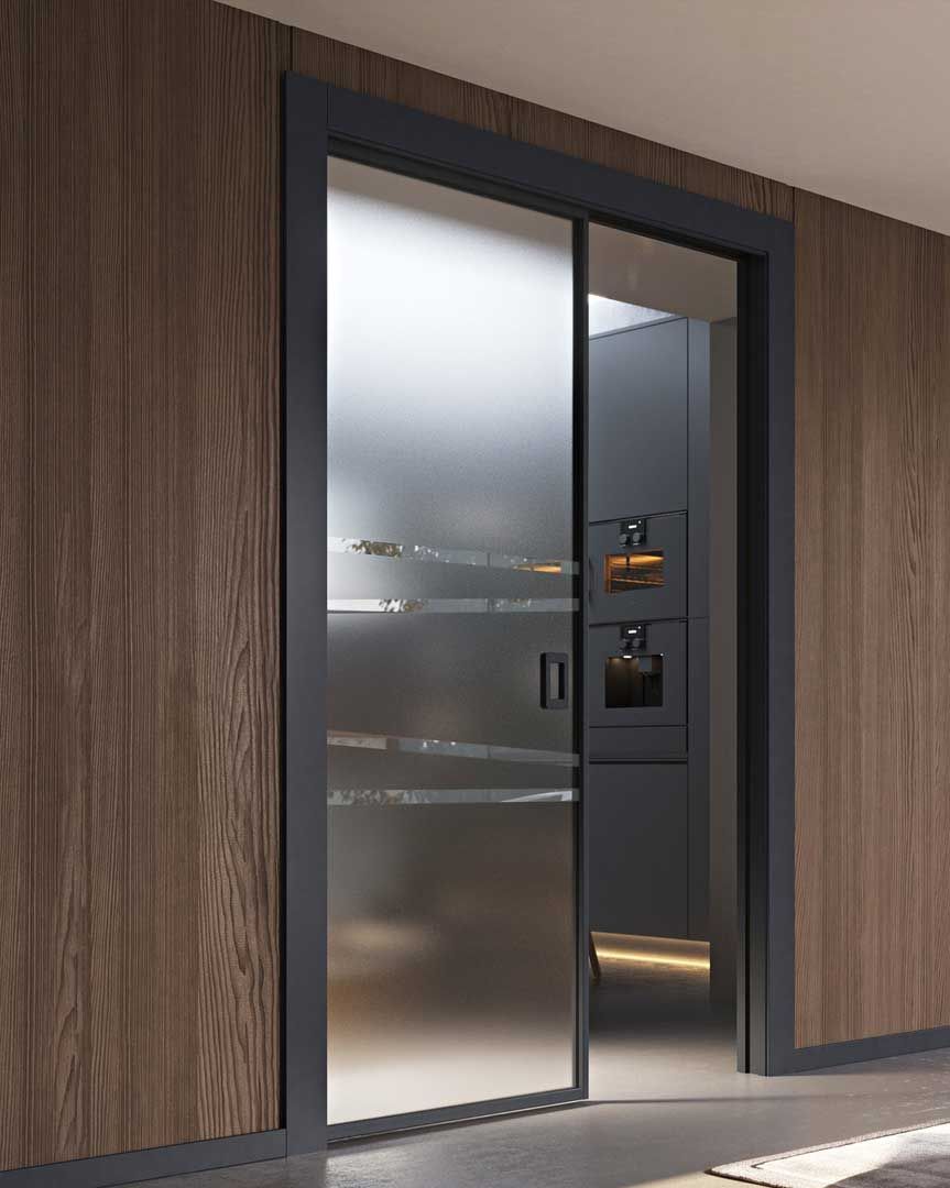 Le Porte Filomuro sono porte perfettamente integrate con la parete senza bisogno di stipiti, cornici coprifilo o cerniere a vista.